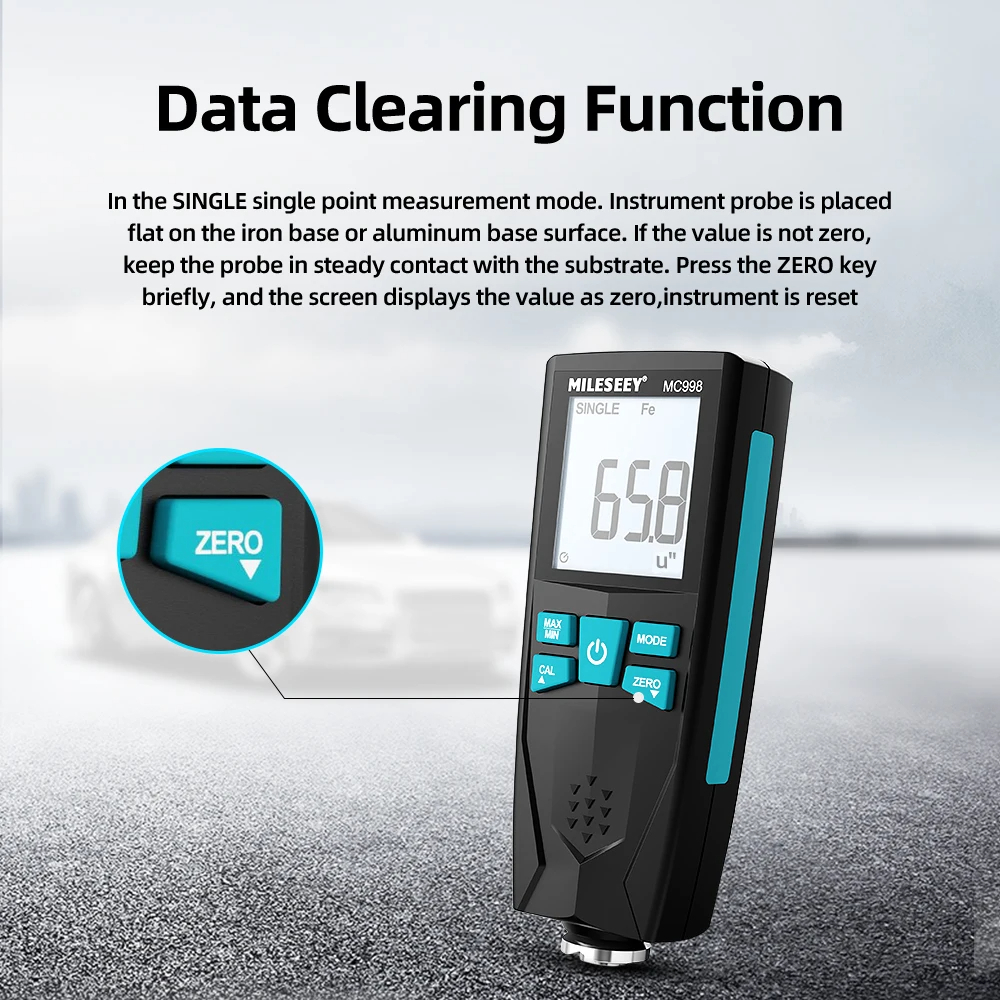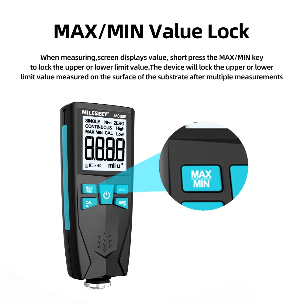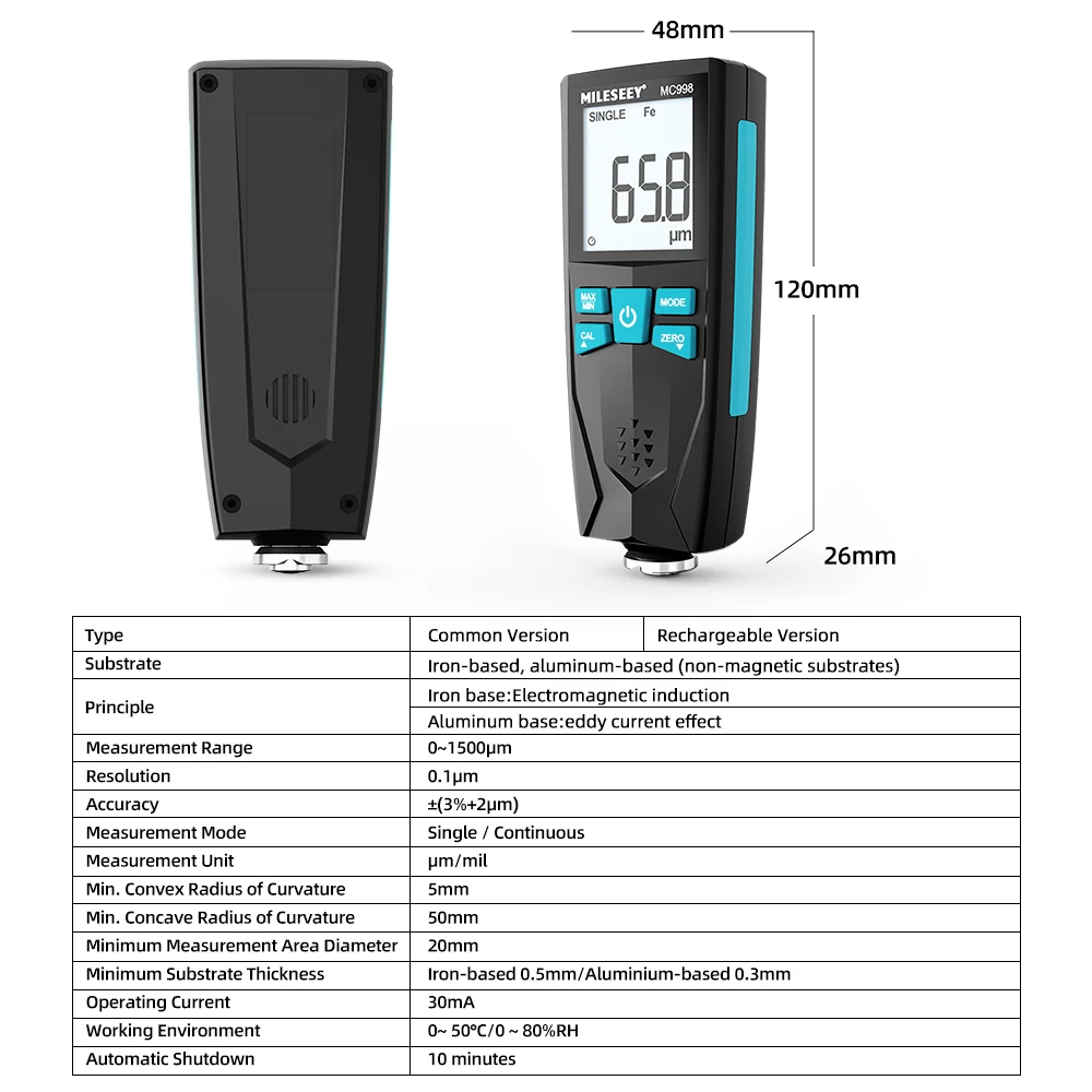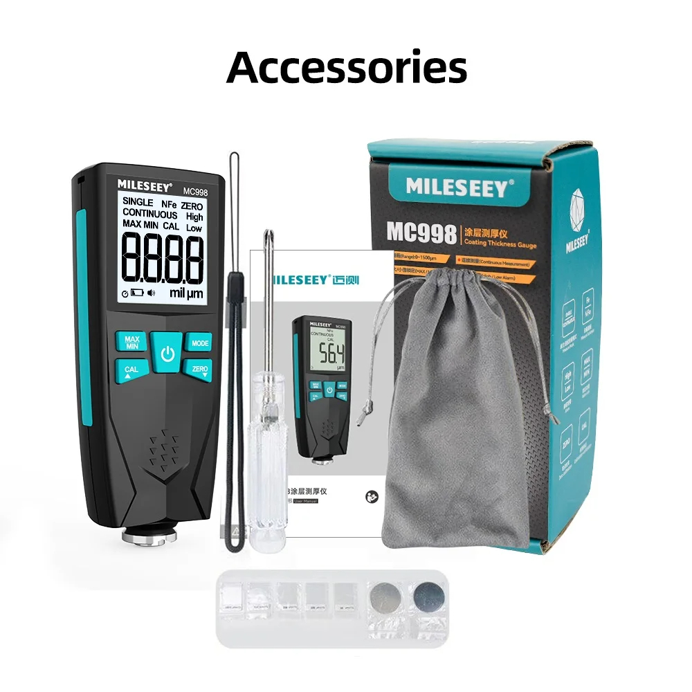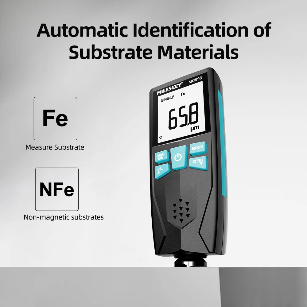 Дебеломерът за боя MILESEEY MC998 е професионален уред за измерване дебелината на боя, предназначен за автомобилни сервизи, бояджии и купувачи на автомобили втора ръка. Устройството измерва покрития върху метални повърхности (стомана, желязо, алуминий) с висока точност, алармена функция и автоматично разпознаване на типа метал. Подходящ е за магнитни и немагнитни субстрати и разполага с голям подсветен екран и ергономичен дизайн.