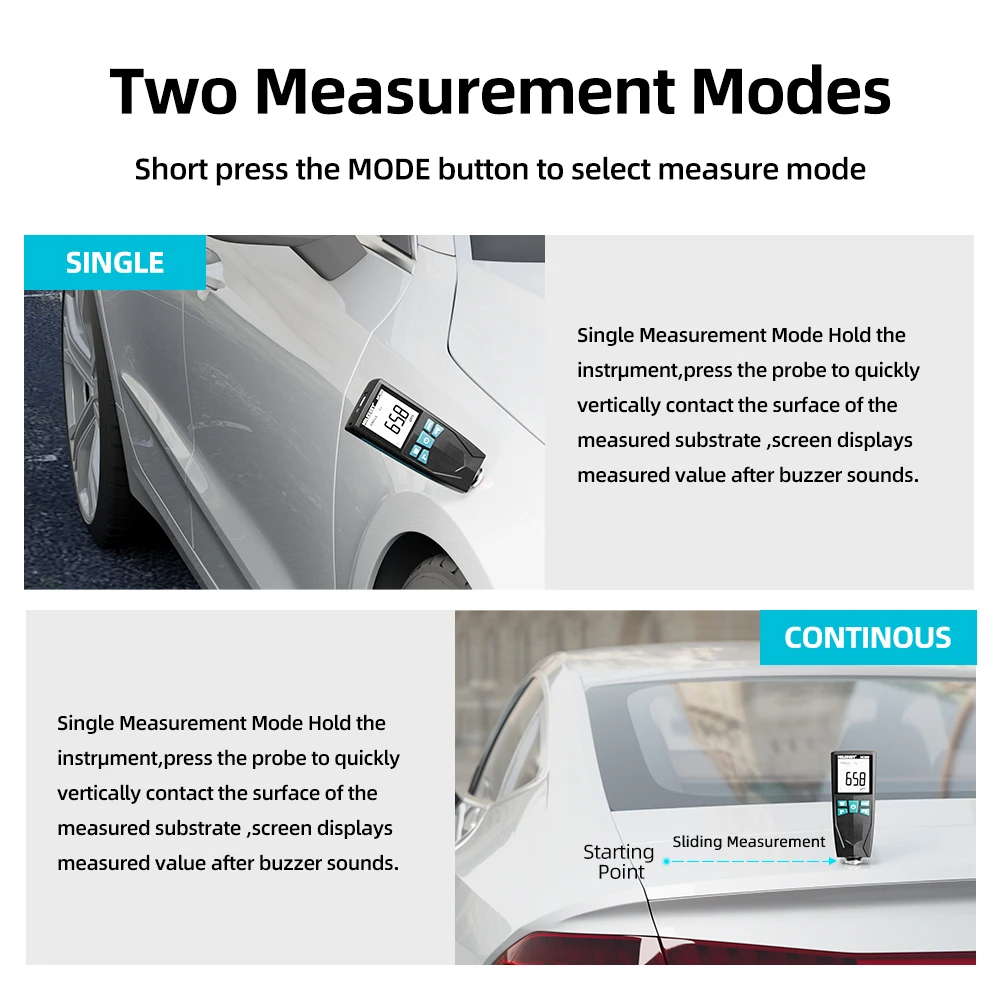 Уредът поддържа режим на единично измерване, както и непрекъснат режим, който позволява плъзгане по повърхността и проследяване на дебелината на покритието в реално време. Предоставя възможност за отчитане на минималната и максималната стойност, както и нулиране и потребителско калибриране. Това гарантира висока точност при всяко измерване – важен фактор при избор на дебеломер за метал и боядисани повърхности.