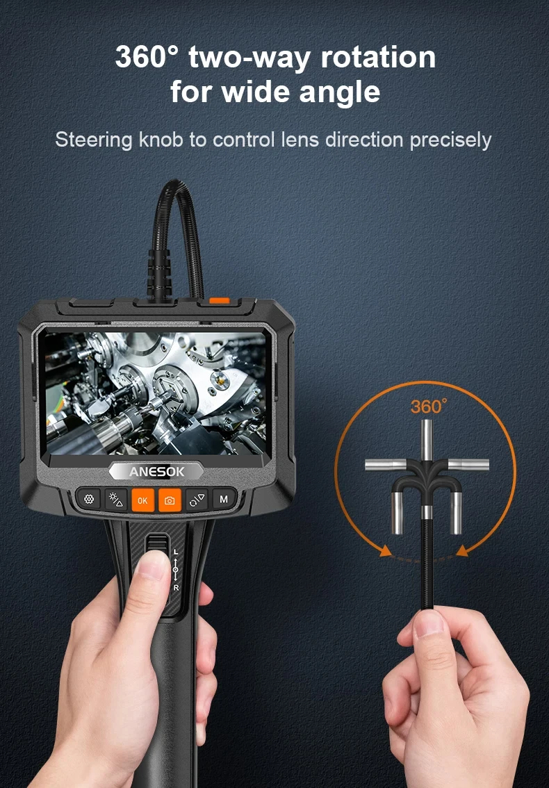 Ендоскопа разполага с иновативен механизъм за 360-градусово двупосочно въртене и тънък 6 мм обектив, които осигурява пълна видимост в инспектираното пространство.