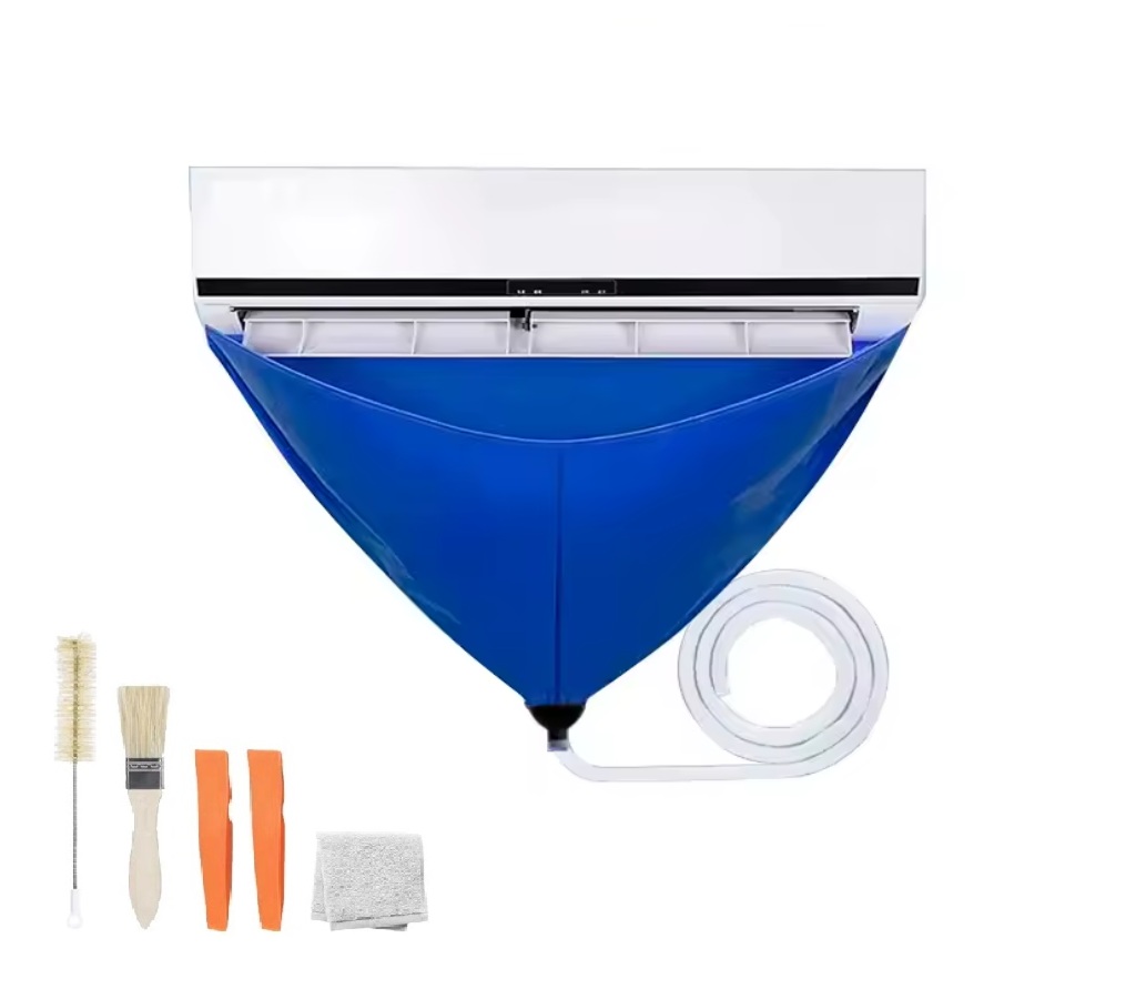 Почистваща торба с дренажен маркуч, специализиран препарат за климатици, мека четка/кърпа и чиста вода за изплакване.