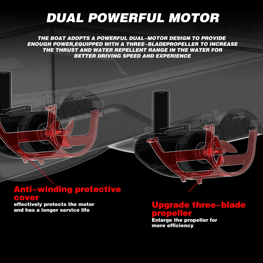 Ярките LED светлини отпред и отзад помагат да виждате посоката на движение и лодката ясно, дори при слаба осветеност или през нощта. Презареждаемата литиева батерия с капацитет 12000 mAh осигурява дълго време на работа – до 4 часа с едно зареждане, което е напълно достатъчно за продължителен риболовен ден.
