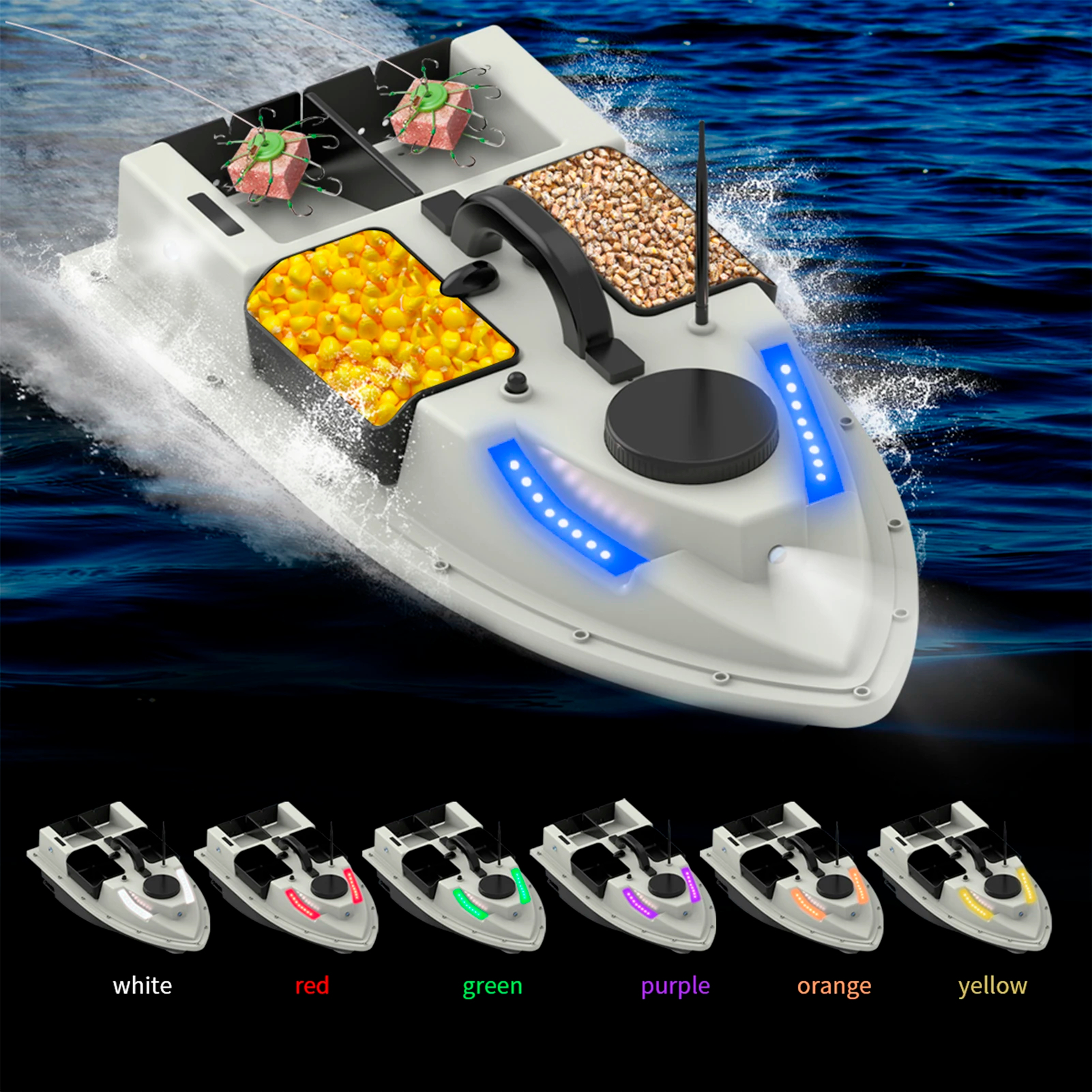 Лодката е оборудвана с ярки LED ленти отпред и отстрани, които осигуряват видимост дори в пълна тъмнина или мъгла.