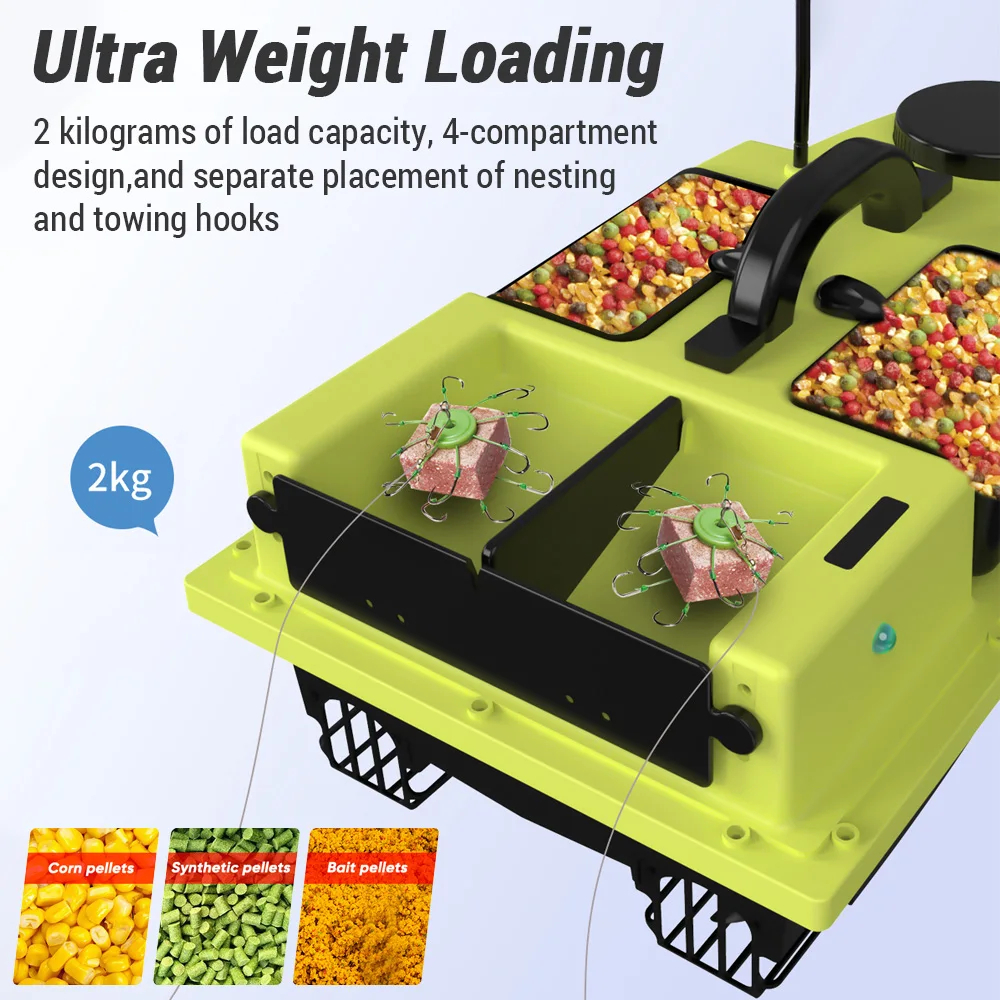 Моделът разполага с 4 отделни отделения за стръв, като всяко може да се контролира поотделно. С обща товароносимост до 2 кг, ще захраните големи зони и ще привлечете повече риба. Идеална за царевица, пелети, топчета или дори тежки монтажи.