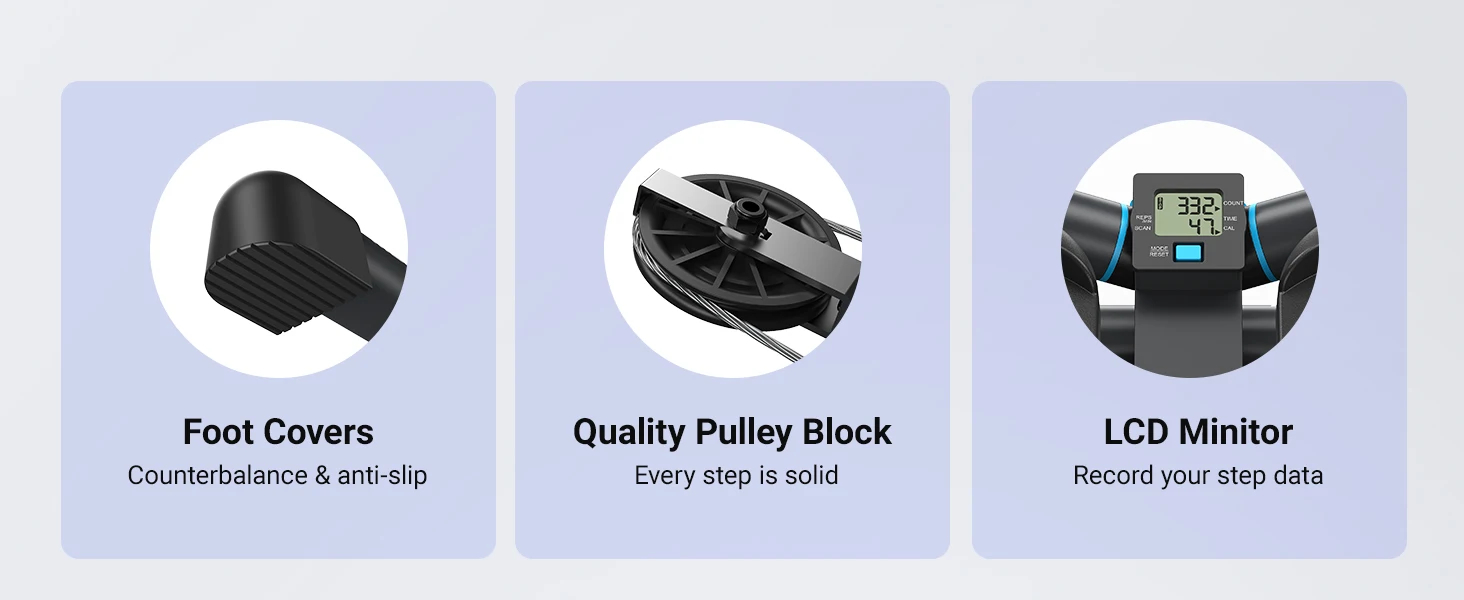 Към основната рамка могат да се закачат включените в комплекта съпротивителни ластици. Те позволяват едновременно да натоварвате бицепсите, раменете и гърба, докато правите стъпки, осигурявайки си комплексна тренировка за цялото тяло. Ластиците могат да бъдат махнати по всяко време, ако желаете да използвате уреда самостоятелно.