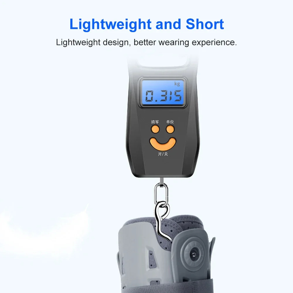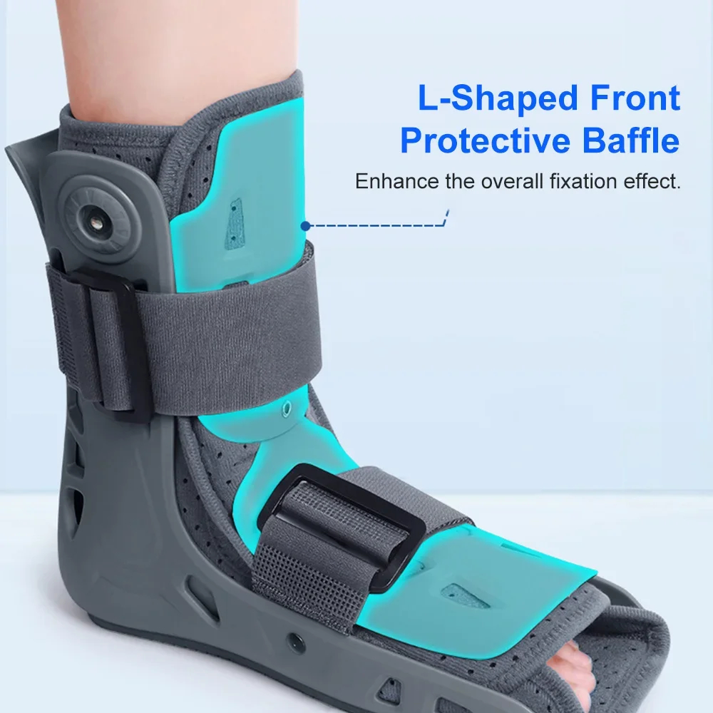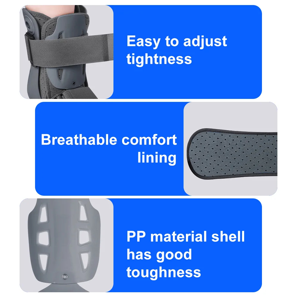 Ортезата за крак е изработена от здрав пластмасов корпус. За допълнителна фиксация е включен L-образен предпазен панел и широки велкро ленти, които прилепват плътно около крака и не позволяват на глезена да се движи.