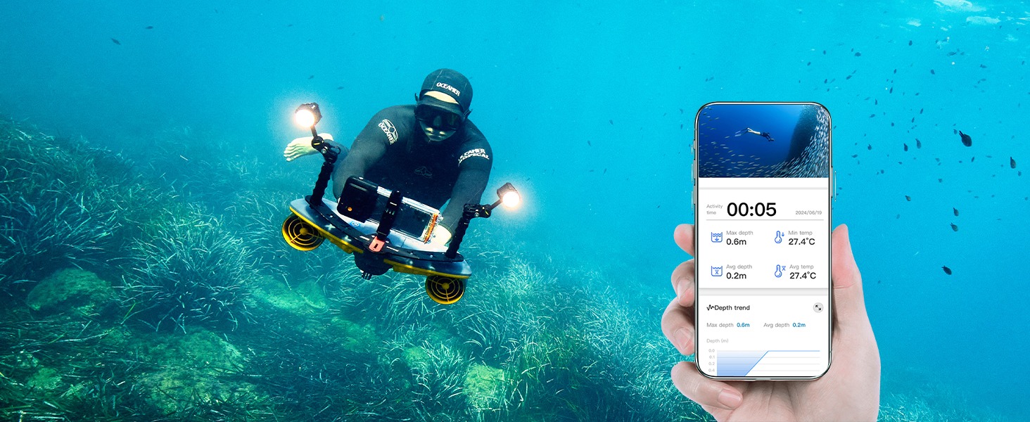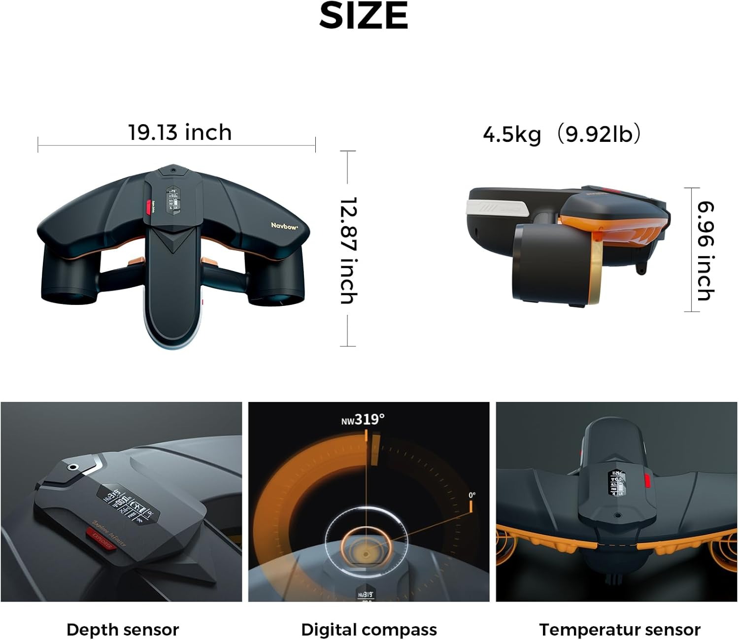 Скутерът е оборудван с OLED екран, който показва информация за скорост, заряд, оставащо време, дълбочина, температура и посока. Благодарение на усъвършенствания 9-DOF сензор и вградения дигитален компас, винаги имате точна навигация и обратна връзка – дори при ниска видимост или силни течения. Всичко това се визуализира ясно, дори под вода.