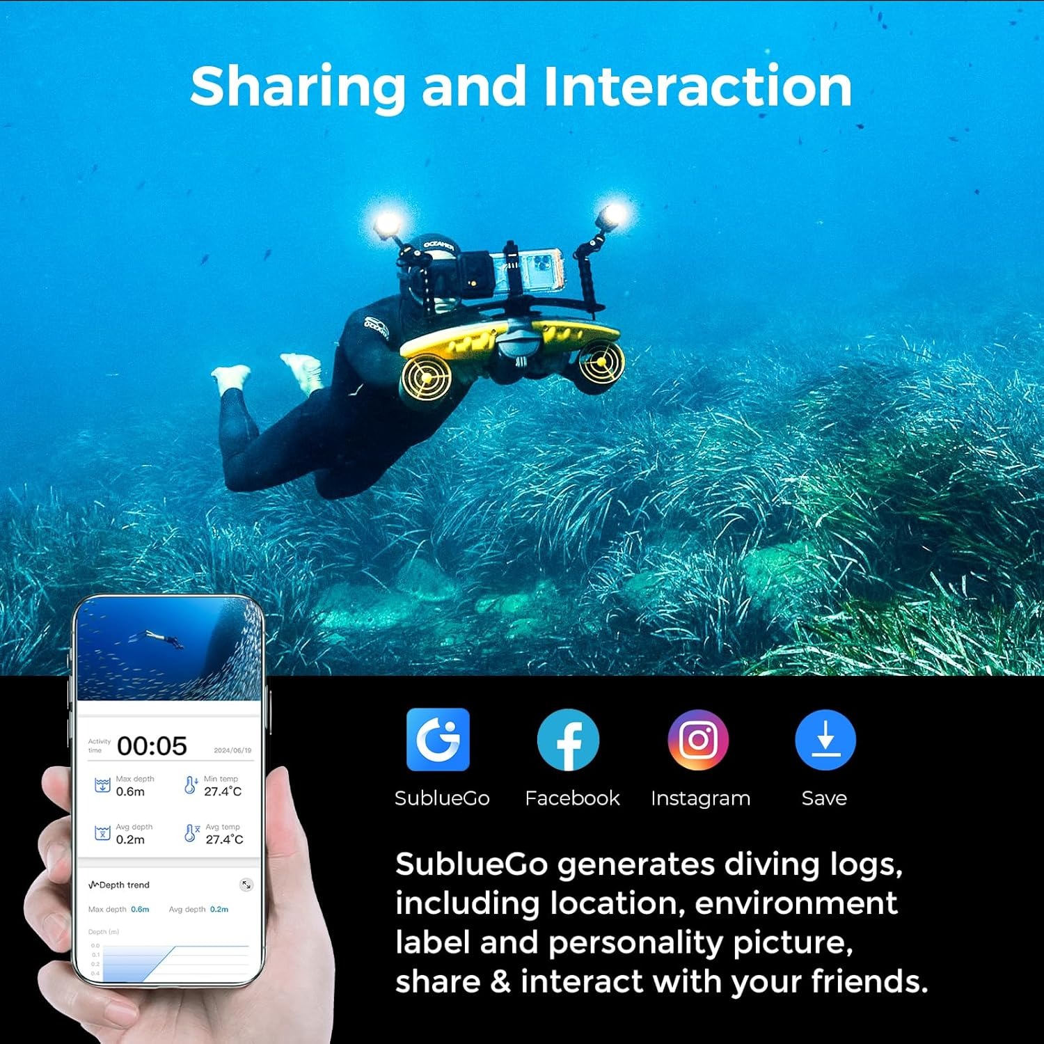 Свържете NAVBOW+ към SublueGo App чрез Bluetooth, за да генерирате автоматично дневник на всяко гмуркане. Приложението записва дълбочина, температура, локация, среда и изображения, които може да се споделят лесно в социални мрежи. Това превръща всяко гмуркане в пълноценно изживяване с архив и история.