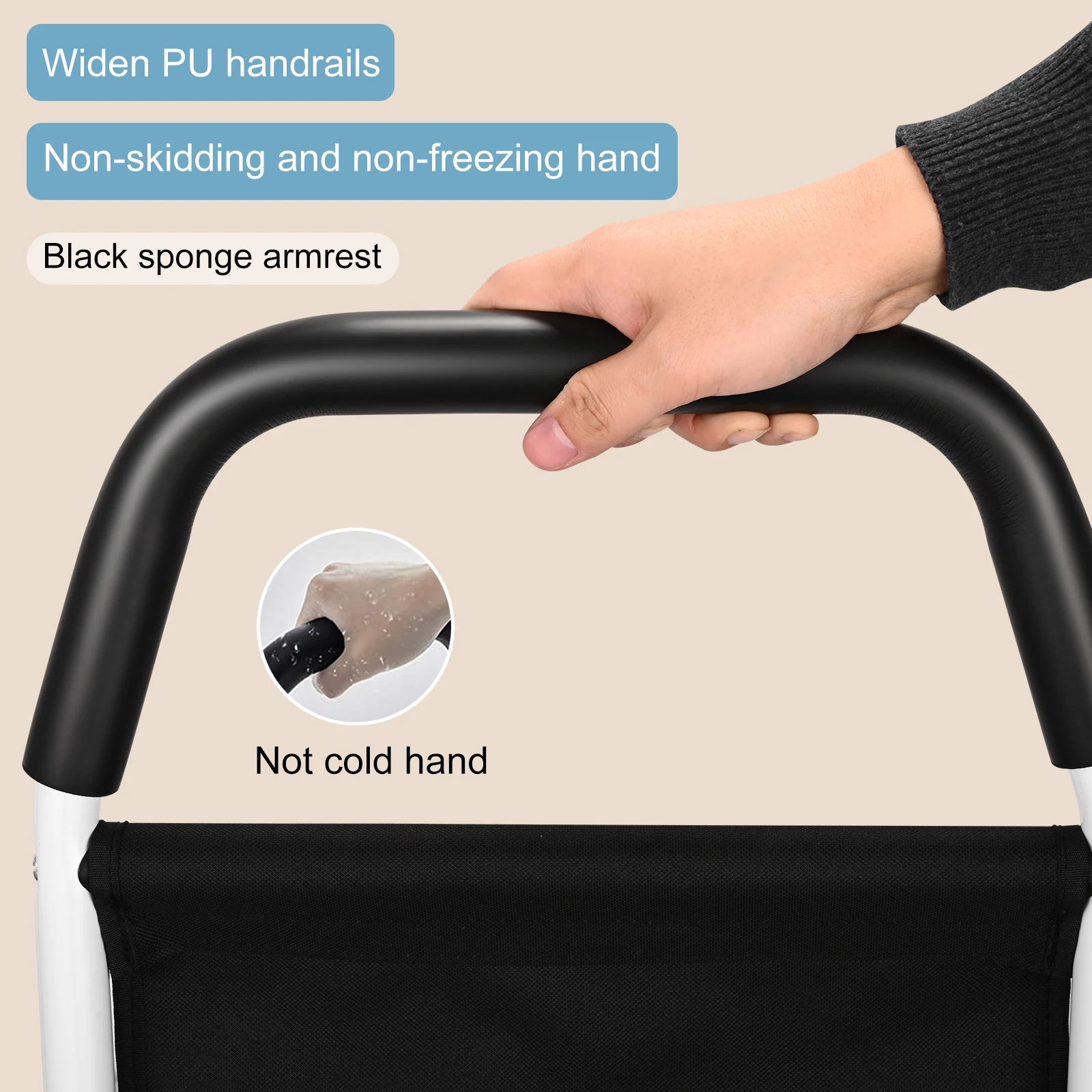 Меката покритие от PU пяна осигурява удобно захващане, не се хлъзга и не охлажда ръцете. Вграденият мрежест джоб побира всичко необходимо до леглото – от книги до медикаменти.