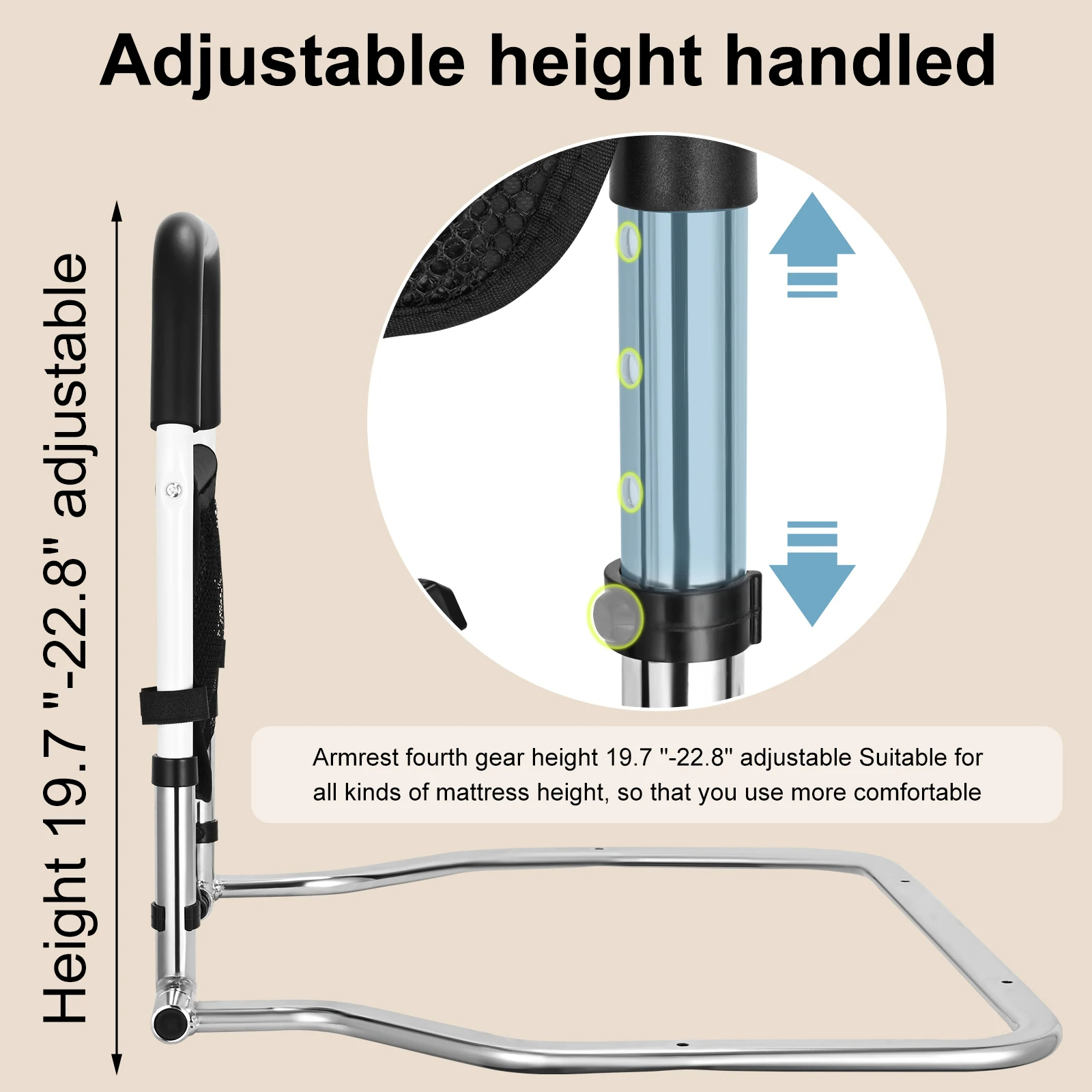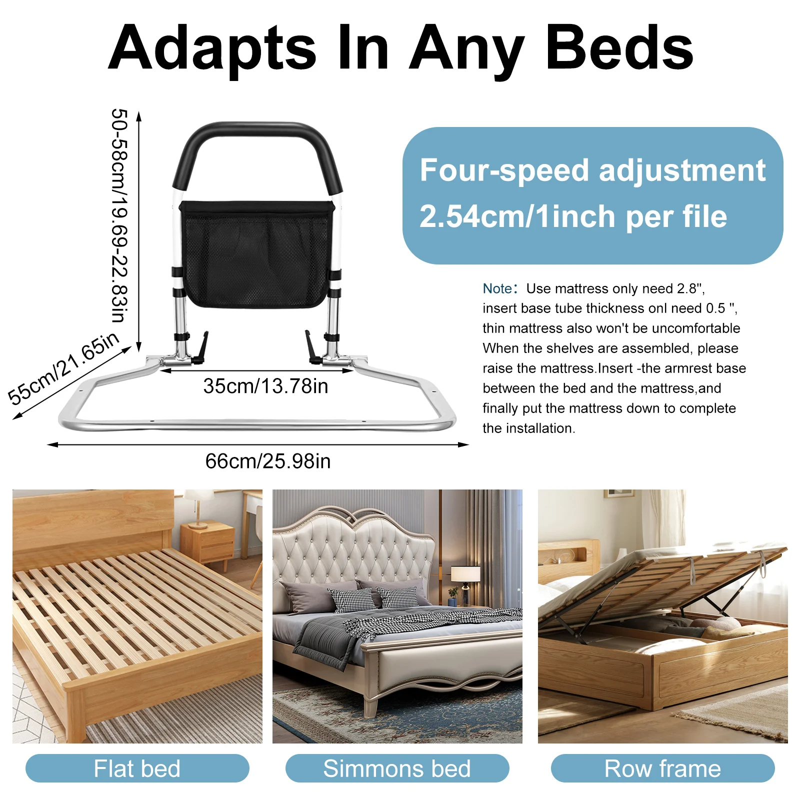 Височината се регулира в 4 степени (от 50 до 58 см) чрез лесна система със C-образен болт. Подходяща е за различни легла: стандартни, с повдигащ се механизъм, с платформи и др. Инсталацията се извършва за няколко минути – без пробиване, без инструменти.
