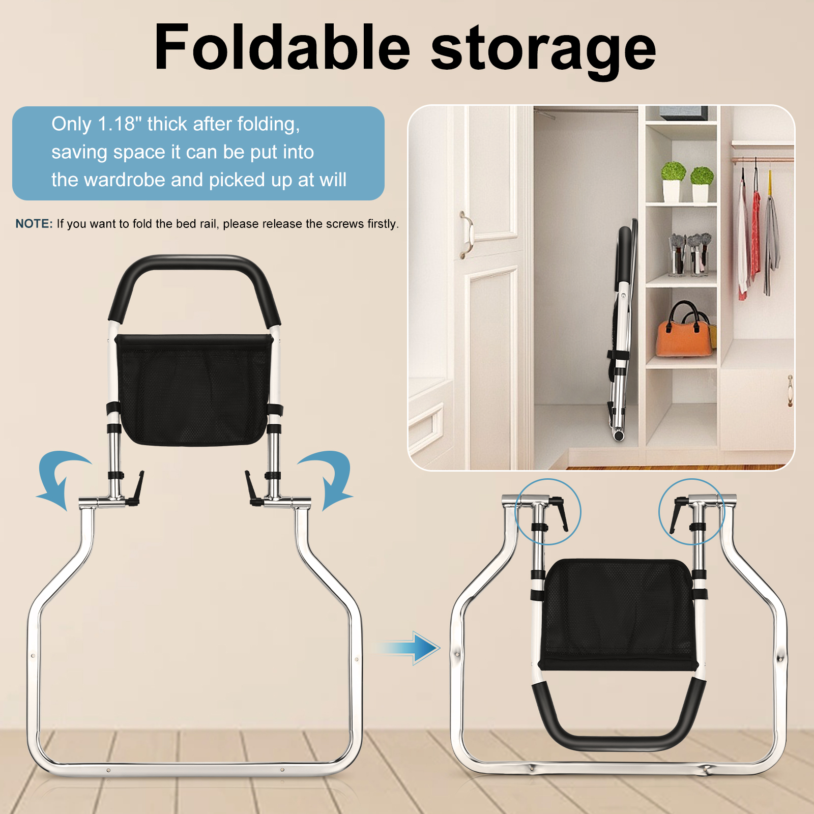 Помощната дръжка се сгъва до 3 см дебелина, за да се съхранява лесно в гардероб или под легло. При нужда се разгъва за секунди – особено полезно при временни нужди или пътувания.