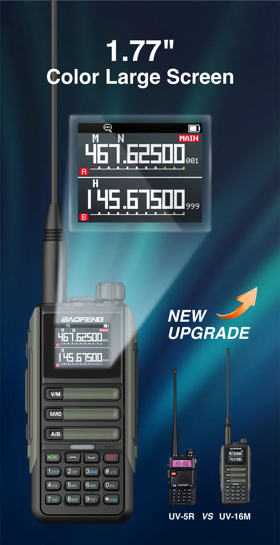 Радиостанция BAOFENG UV16M-V2 е актуализираната версия на моделите UV-5R и UV-16 и е проектирана за да Ви осигури по-голям обхват и безупречна връзка по време на работа или лов. Моделът е с предавателна мощност от 15W, честотен обхват от 65 до 520 MHz за приемане, 999 канала и защита от вода и прах по стандарт IP67. 1.77-инчов цветен LCD монитор предоставя отлична четимост на двете работни честоти едновременно, като визуализира и активните режими на работа.
