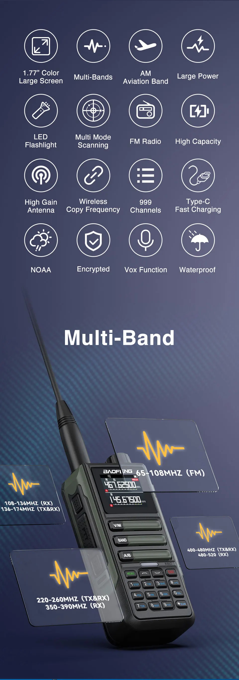 - VHF и UHF ленти: Пълно приемане и предаване (TX/RX) в обхватите 136-174MHz, 220-260MHz и 400-480MHz.