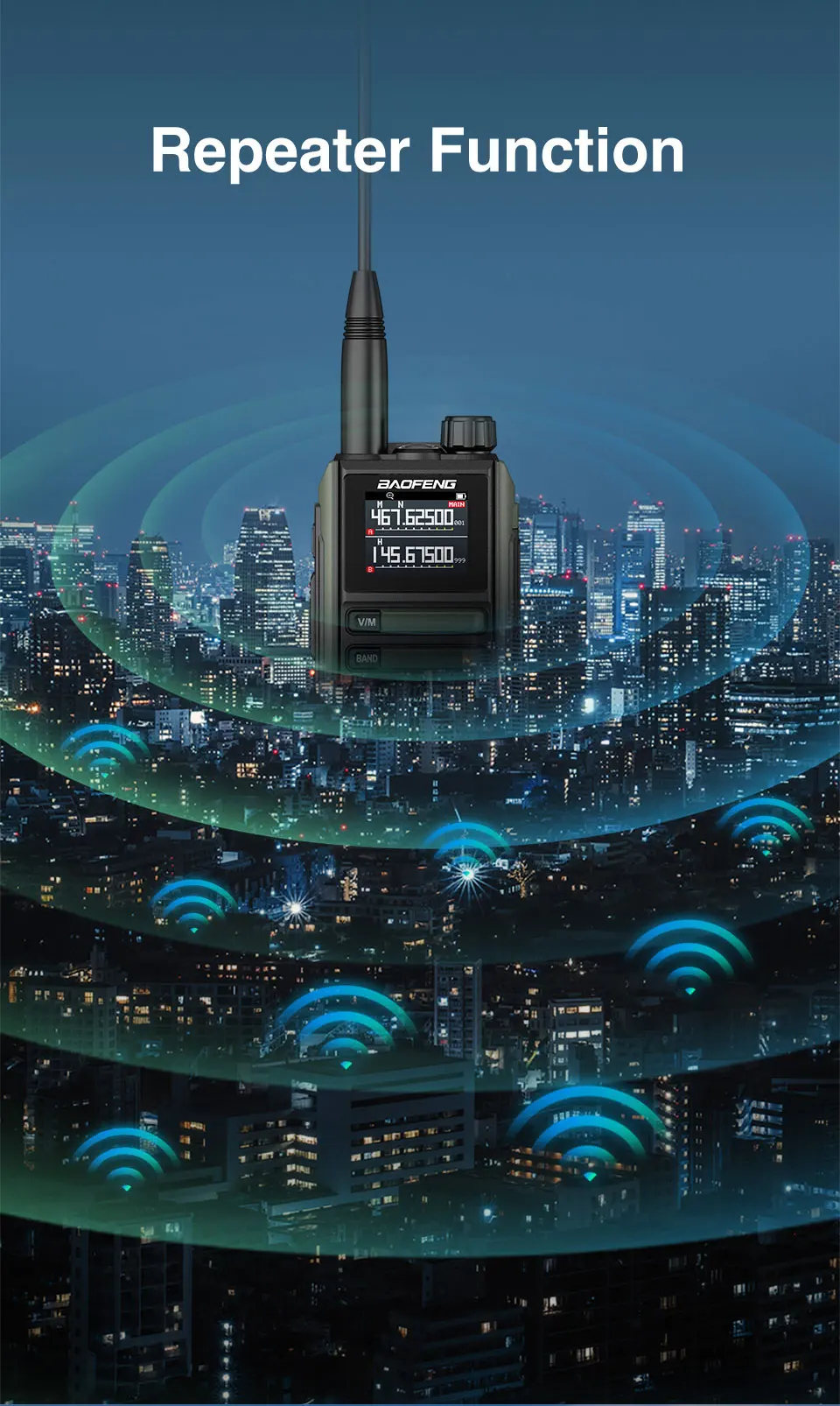 - Repeater функция: позволява на радиостанцията да действа като ретранслатор за разширяване на обхвата на мрежата