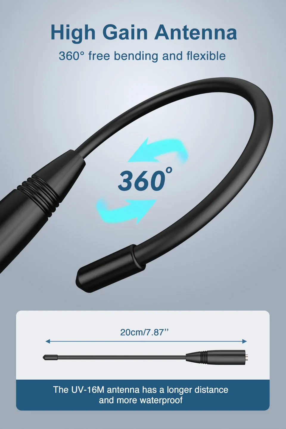Антената е с дължина 20 см и се огъва на 360 градуса, което я предпазва от механично увреждане.