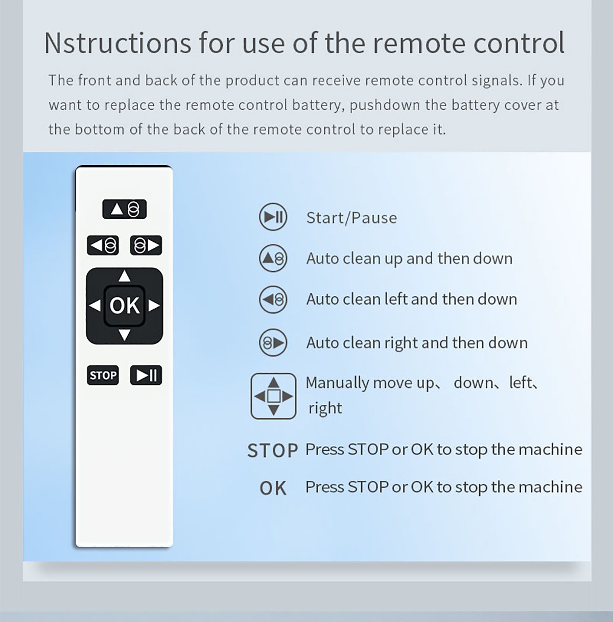 С едно натискане на бутона можете да стартирате, спрете или насочите робота. Включеното дистанционно управление предлага различни режими: движение нагоре, надолу, наляво, надясно или автоматично почистване. Управлението е интуитивно и удобно дори за начинаещи потребители.