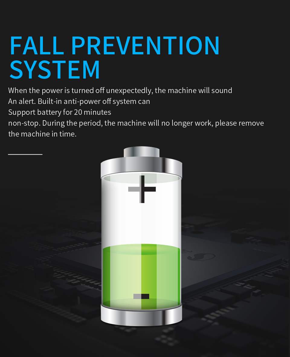 В случай на прекъсване на захранването, вградената литиева батерия активира система за безопасност, която задържа робота върху прозореца до 20 минути. Това ви дава достатъчно време да го свалите спокойно с помощта на включеното обезопасително въже. Уредът издава звуков сигнал, ако се нуждае от внимание.