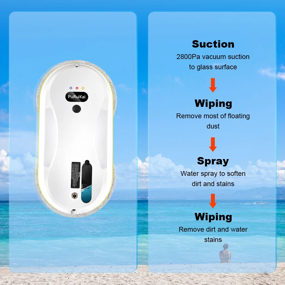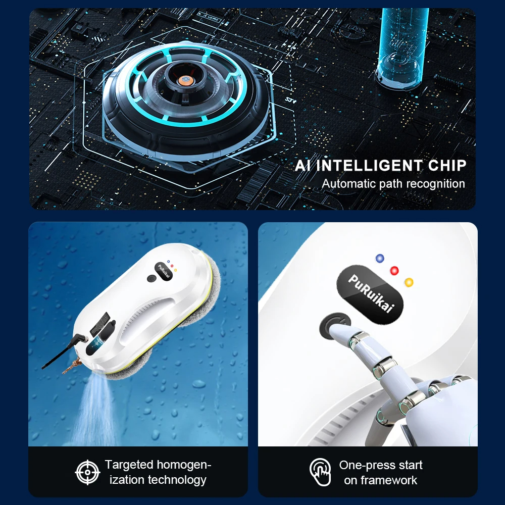 Роботът за миене на прозорци PuRuiKai 309 разполага усъвършенствана MEMS навигация, която го насочва по последователни линии, преминавайки през всяка част от повърхността. Уредът има три режима на работа – автоматичен, локален и ръчен. Може да бъде избрано пълно почистване, почистване на конкретни зони или да се управлява чрез дистанционното. Металната ултразвукова дюза разпръсква фино и равномерно препарат или вода, за да премахне всякакви замърсявания. Това го прави изключително ефективен при засъхнали капки, отпечатъци или прах.