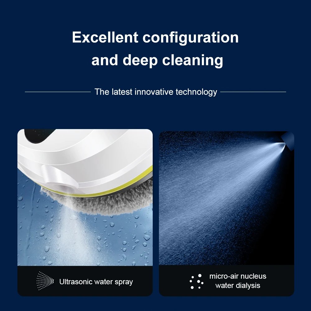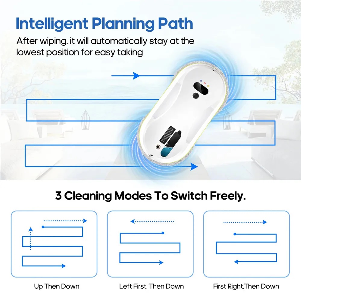 Роботът за почистване на прозорци е с висока вакуумна мощност от 2800 Pa, която осигурява надеждно закрепване върху вертикални повърхности като прозорци, витрини, плочки и огледала. При внезапно спиране на захранването се включва UPS защита, която ще задържи робота здраво закрепен до 20 минути. Това осигурява достатъчно време, за да го свалите спокойно. За допълнителна сигурност е включено и предпазно въже с дължина 4 метра.