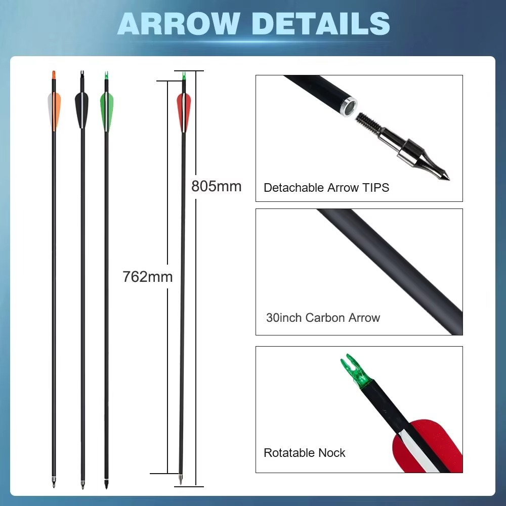 Комплектът включва 12 карбонови стрели с дължина 80.5 см и диаметър 7.8 мм. Върховете са разглобяеми, което позволява лесна подмяна или надграждане според нуждите.