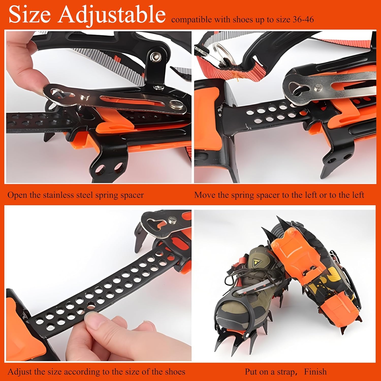 Котките за сняг и лед са оборудвани с механизъм за регулиране на дължината, който ги прави подходящи за обувки от 36-ти номер до 46-ти номер. След като се фиксират, ледоходите остават неподвижни и плътно прилепнали към подметка.